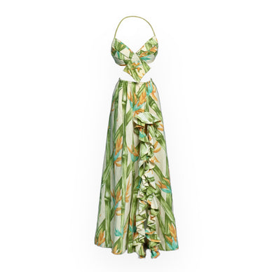 A tropical statement reimagined for modern resort living, Isla Verde is crafted from a breathable cotton-blend with a soft, fluid drape. The halter cut-out top balances boldness with elegance, while the cascading ruffle-slit skirt delivers movement and drama.