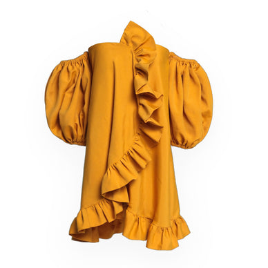 Bask in radiant confidence with Solana. Crafted from 100% linen in a golden amber hue, this mini dress is defined by voluminous puff sleeves and cascading ruffles that bring sculptural energy to the silhouette.